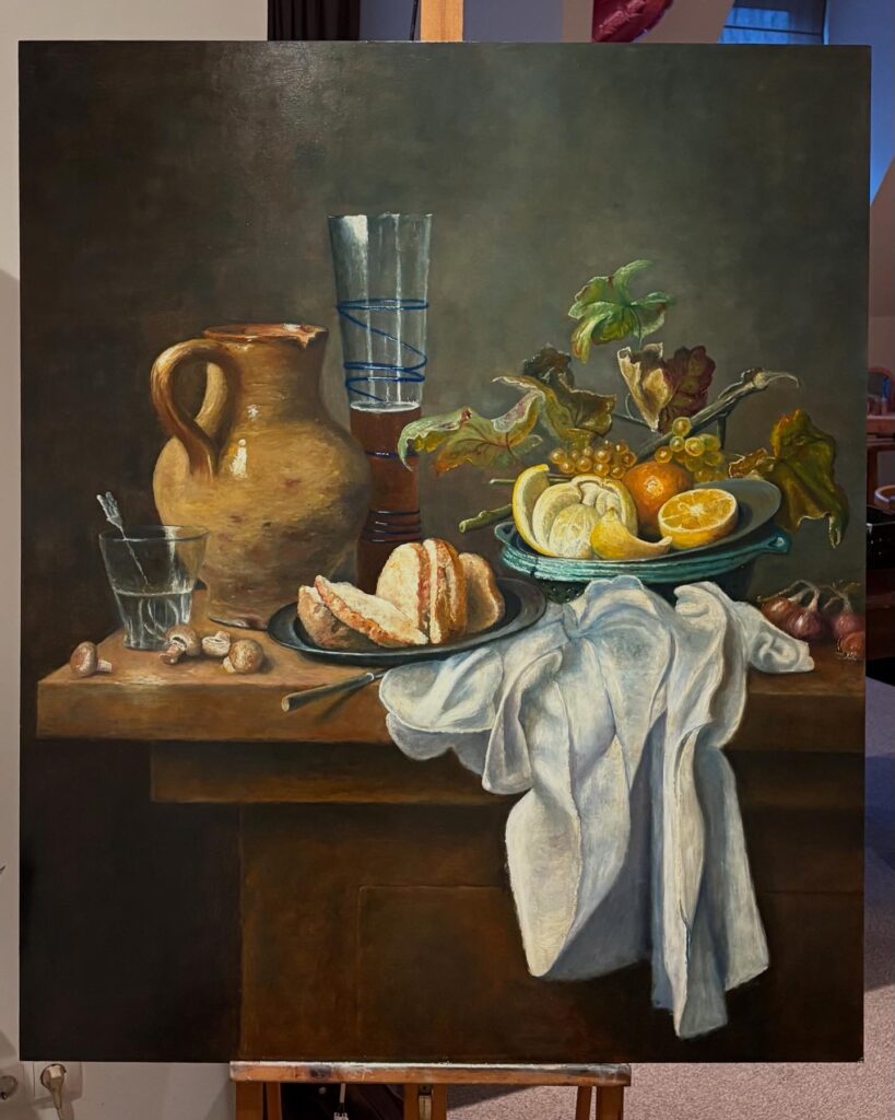 Copy Cornelis le Mair – Stilleven met gele kruik, pasglas, brood en witte doek, oil on panel, 118 x 100